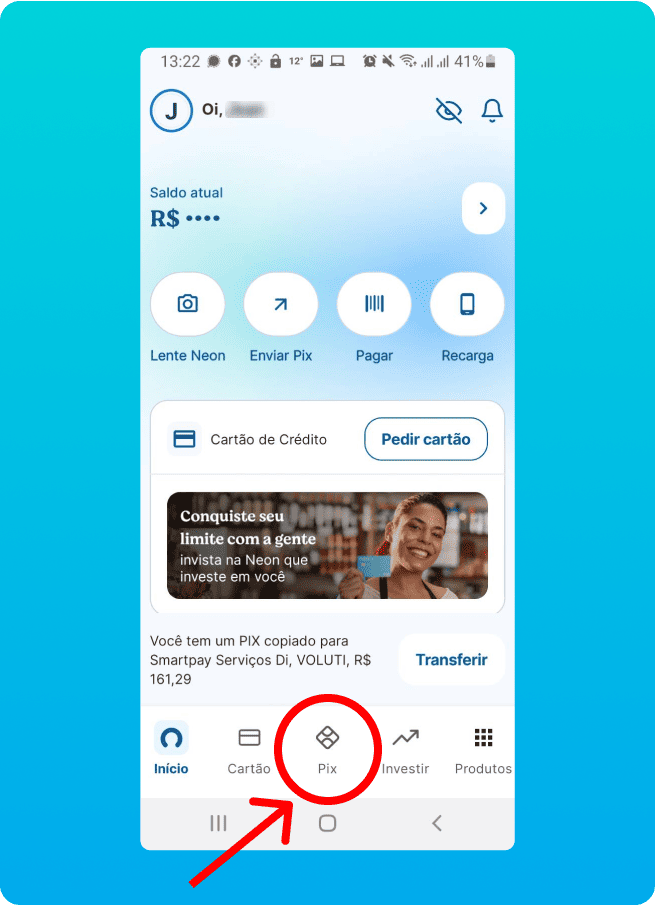 Abra seu aplicativo do Neon e selecione a opção "PIX".