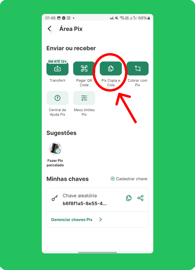 Cole o "Código PIX" e clique no "Botão de Seta" para avançar.